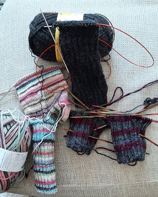 Sukkia on kolmet kesken. Tummat sukat Regian tweedistä aloitin lauantain neulefestareilla (kts.edellinen postaus). Oli pakko ostaa lankaa ja puikot, kun ei ollutkaan kassissa neuletta. Ollaan jo tuosta kuvasta eteenpäin jalkaterässä ja kiilakavennukset on takana. Viime vuonna ostettu Super Soxx color Madrid-lanka on raidallinen ja toinen sukka on jo menossa kantapäässä. On ollut koulutuksia ja kokouksia, joissa olen neulonut. Tumma sukka on vähän hankalaa huonossa valaistuksessa neuloa ja oli pakko aloittaa vaaleammasta langasta. Festareilla neuleystävä esitteli neulomiensa raitasukkien kuvia. Oli pakko aloittaa miesten sukat Seitsemän Veljestä- langasta.