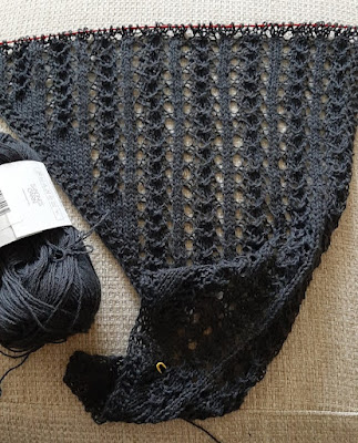 Toivo-huivi. Ensiksi ajattelin olla neulomatta huivia; pitsi ja minä ei oikein olla ystäviä. Aloitin kuitenkin huivin 10.6. ajatellen tätini hautajaisia;mustan mekon seuraksi tarvitsin jotakin. Langaksi valitsin